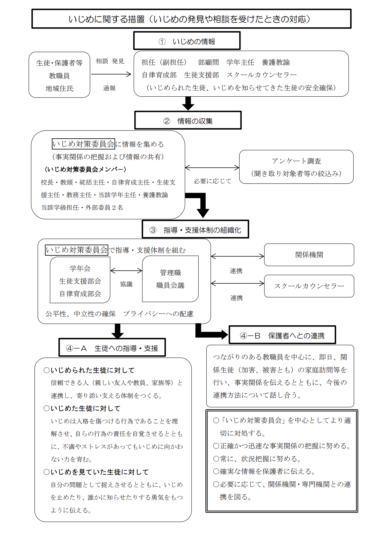 本校の「学校いじめ防止基本方針」は、国や県の基本的な方針を参酌し、これまで以上のいじめの防止、いじめの早期発見及び対処の対策を、総合的かつ効果的に推進するために策定した。本基本方針に示したいじめの防止等の対策は、いじめを受けた生徒の生命、心身を保護することが特に重要であることを認識しつつ、学校、家庭、地域住民その他の関係者の連携の下、いじめの問題を克服することを目指して行うものである。