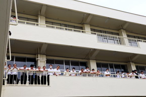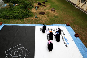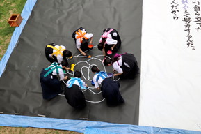 書道部の引退パフォーマンスが昼休み中庭で実施されました。