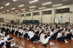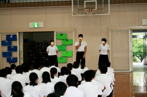 運動会の班に分かれて初めて顔合わせの集会を第1体育館、第2体育館、軽スポーツ場にわかれて行いました。