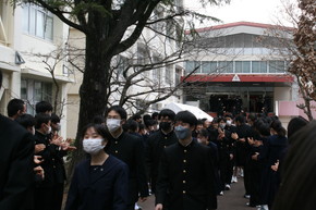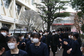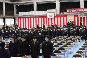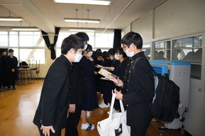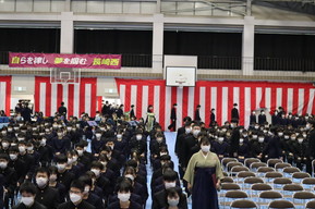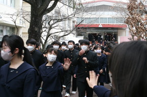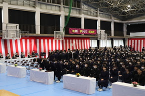 第75回卒業証書授与式 2023年03月01日(水) 第75回卒業証書授与式を挙行しました。新型コロナウイルス感染防止の観点から、1年生は第2体育館でのリモート配信、2年生のみ体育館での参加となりました。 ◇卒業証書授与式の様子 卒業生入場 卒業証書を授与総代・森山さん(3組) 校長式辞 卒業生退場 1年生が花道を作りました。 第2体育館での様子 ホームルーム後、部活動ごとにお別れ会をしました。
