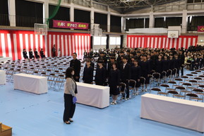 第80回入学式 2025年04月09日(水) 第80回入学式を挙行しました。 2年生が新入生を迎える準備をしています。 新入生入場 校長式辞 新入生代表宣誓 音楽部の生徒も校歌斉唱に加わります。 生徒会長歓迎のことば 吹奏楽部による歓迎演奏 新入生退場 入学式が終わり、初めてのLHRです。 1組 2組 3組 4組 5組 6組 7組 ◇PTA入会式 入学式終了後、PTA入会式を行いました。 PTA会長あいさつ 少年サポートセンターの方より携帯電話のフィルタリング等についてのお話がありました。