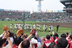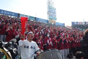 1981年に喫したノーヒットノーラン以来の悲願であったヒットが初回に生まれ、さらに先取点を挙げるなど、試合は序盤から大きな盛り上がりを見せました。当日は、本校から16台のバスによる全校応援を実施し、多くの生徒・関係者が球場に駆けつけました。