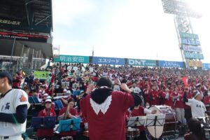 試合は終盤まで接戦が続き、結果は4対5で惜しくも敗れましたが、選手たちは最後まで粘り強く戦い抜きました。スタンドでは、1・2年生の在校生をはじめ、今春の卒業生、同窓会の皆様、野球部OB・OG、保護者の方々が一体となった力強い応援を送り、会場は大きな一体感に包まれました。