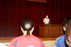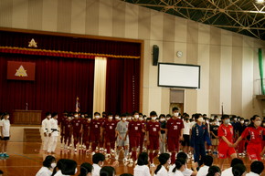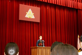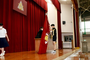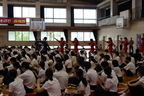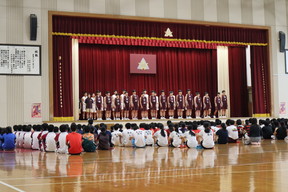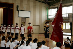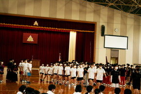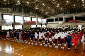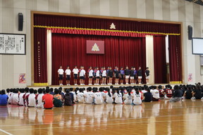 新型コロナウイルス感染防止の観点から、1・2年生は教室でのリモート配信、3年生は、体育館に集合して壮行式を行いました。14競技に出場します。