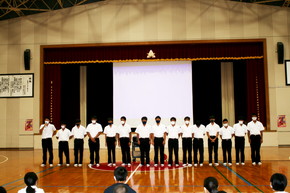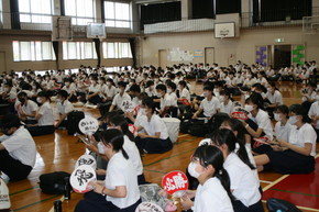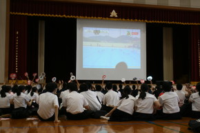 高総体1日目 水球部応援 2022年06月04日(土) 高総体1日目、第1体育館に水球の試合を配信しました。書道部が1枚ずつ書いた団扇をもって、学校に残った全生徒で応援しました。 試合も11対9で勝利。見事2連覇を果たし、九州大会に出場します。 体育館での報告の様子